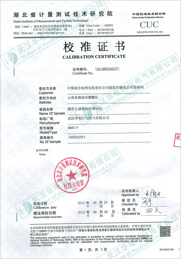 HKHL-100A回路電阻測試儀校準(zhǔn)證書