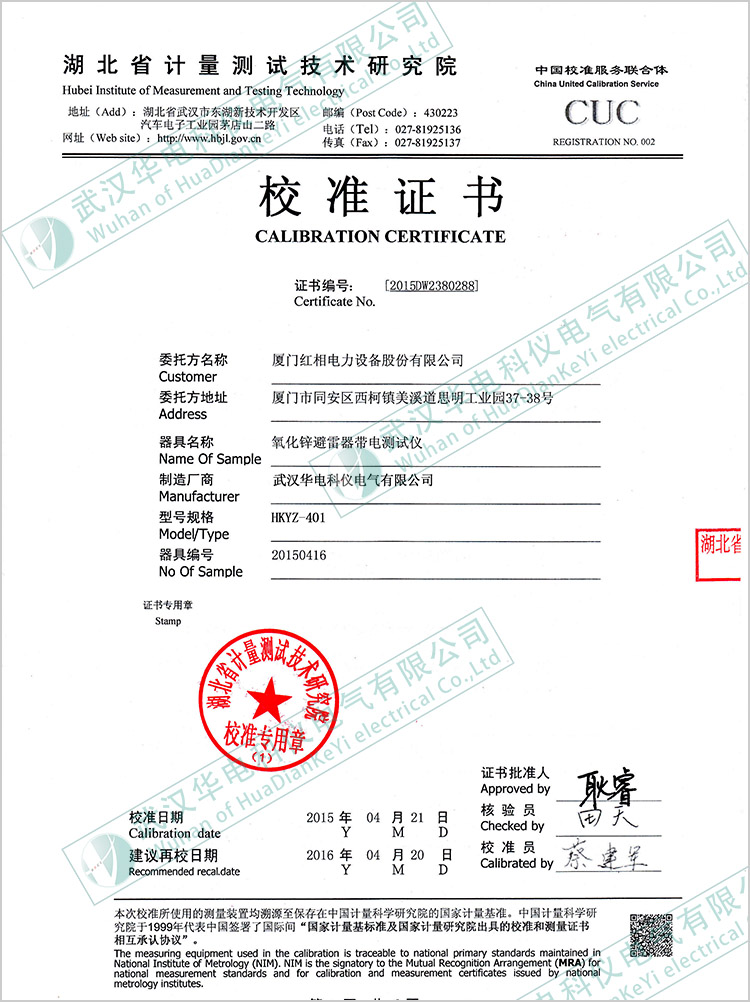 HKYZ-401氧化鋅避雷器帶電測試儀校準(zhǔn)證書