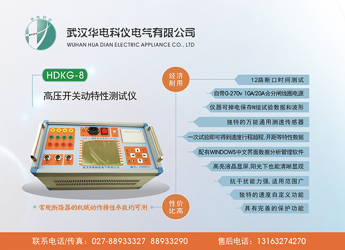 武漢華電科儀電氣有限公司生產(chǎn)的高壓開關(guān)特性測(cè)試儀適用于各種戶內(nèi)、戶外少油、多油開關(guān)、真空開關(guān)、六氟化硫開關(guān)的動(dòng)特性測(cè)試,F(xiàn)場(chǎng)交流電源應(yīng)符合220V±10%,50Hz 工頻電源。使用時(shí)最好將儀器接地。