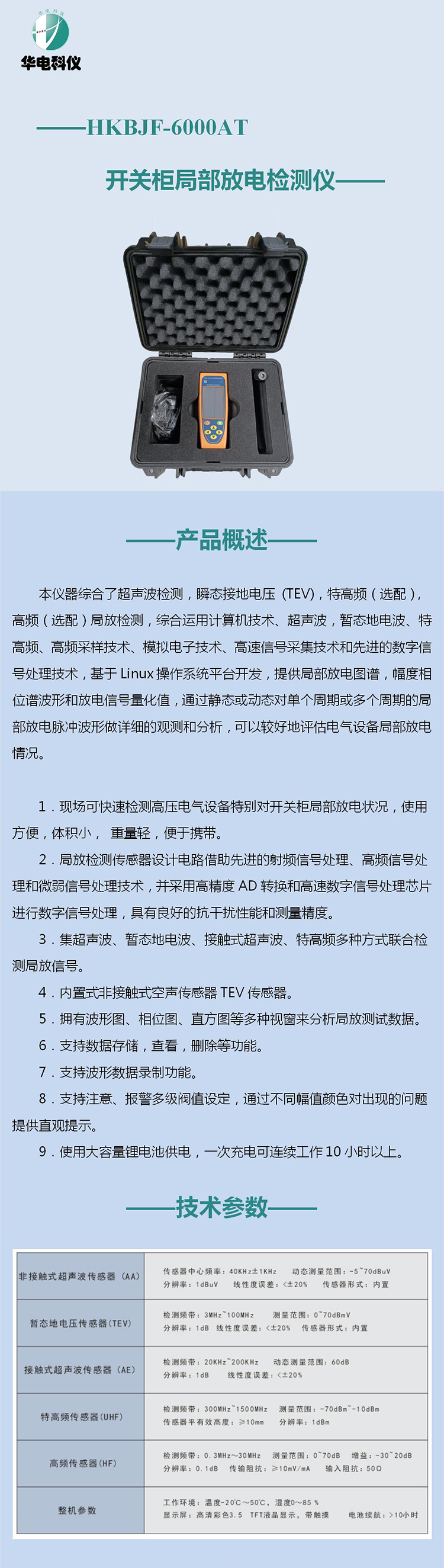 1) 現(xiàn)場可快速檢測高壓電氣設(shè)備特別對開關(guān)柜局部放電狀況,使用方便,體積小, 重量輕,便于攜帶。