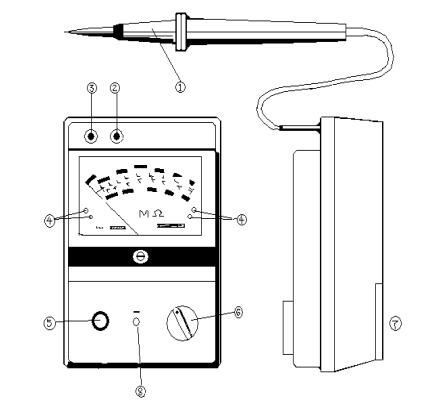 ①測試探頭 ②接地保護端 ③地端 ④指示高低范圍發(fā)光二極管 ⑤測試按鈕⑥功能開關(guān) ⑦電池蓋板 ⑧充電型直流電源插孔(2520 此處為電池檢測)